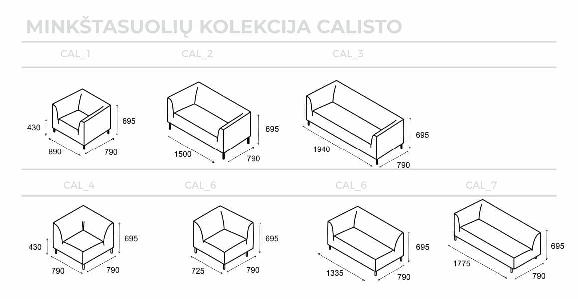 Minkštasuolių išmatavimai ir kainos be PVM pagal komplektaciją: